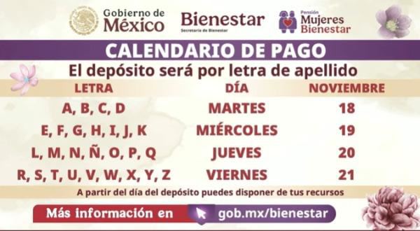 A partir del dia de hoy 18 y hasta el 21 de noviembre, las mujeres de 60 a 64 años inscritas en agosto a la Pensión Mujeres Bienestar y que recibieron su tarjeta en octubre obtendrán su primer pago de 3 mil pesos, según el calendario oficial por letra del primer apellido.