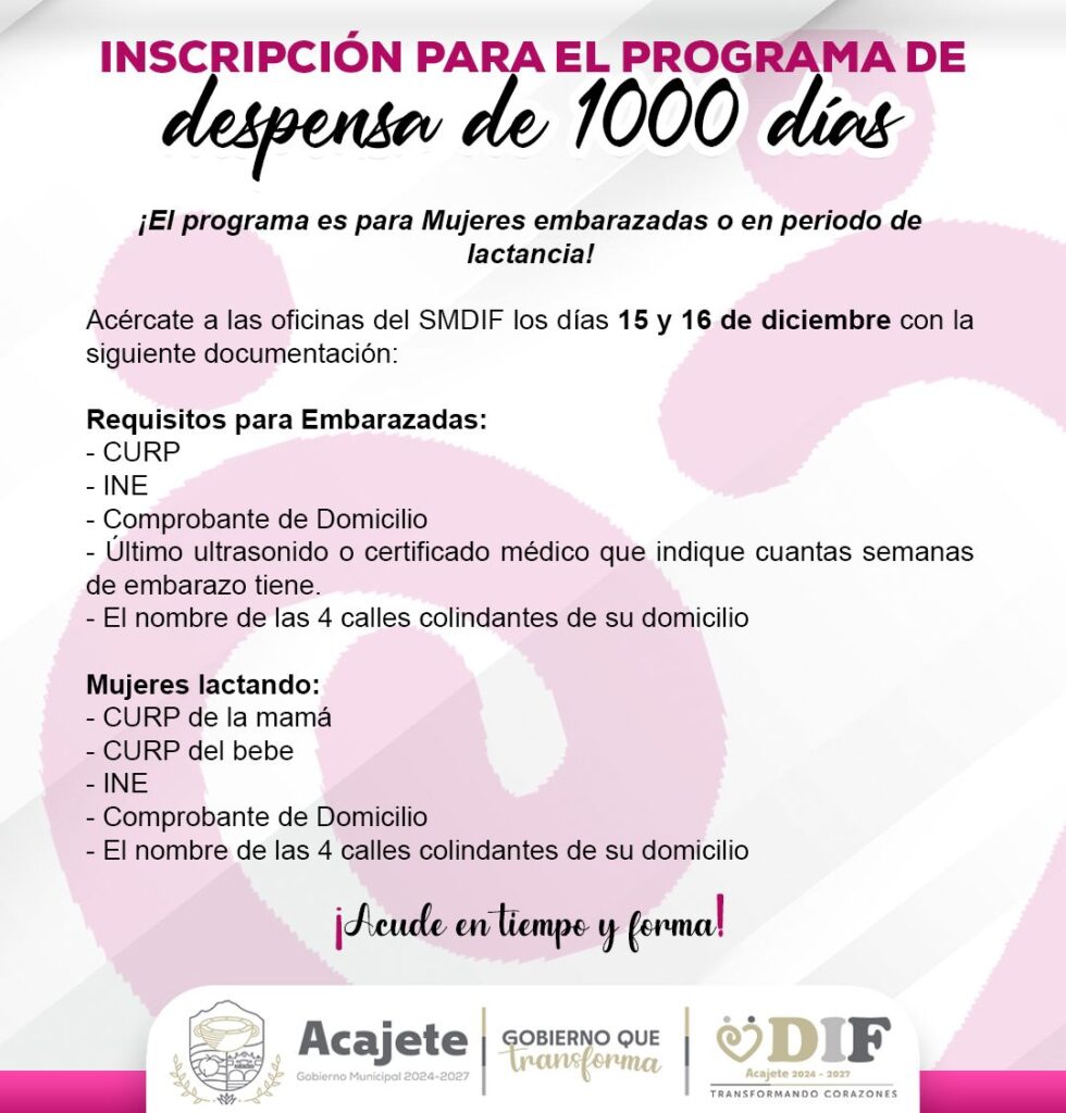 Autoridades municipales informaron que ya se encuentran abiertas las inscripciones al Programa de Despensa de los 1000 Días, un apoyo dirigido a mujeres embarazadas y en periodo de lactancia del municipio de Acajete, con el objetivo de fortalecer el bienestar de las mamás y el desarrollo de sus bebés.