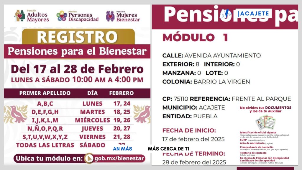 Los interesados deberán presentar la documentación requerida y acudir en la fecha que corresponda a la primera letra de su apellido. Para conocer el módulo más cercano, pueden consultar la información en el sitio web oficial: https://ubicatumodulo.bienestar.gob.mx/