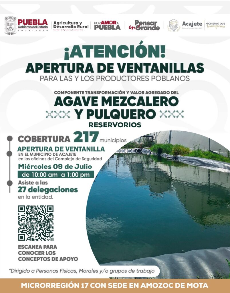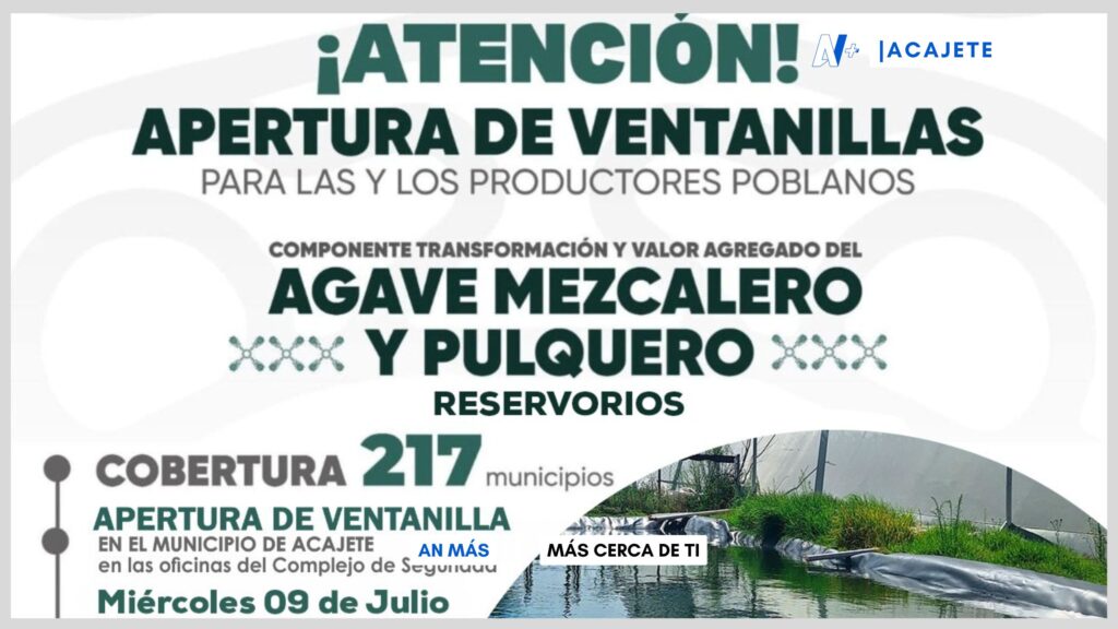 Acajete, Puebla. — ¡Buenas noticias para los productores poblanos! A partir de este miércoles 9 de julio se abrirá la ventanilla para acceder al programa “Componente, Transformación y Valor Agregado del Agave Mezcalero y Pulquero – RESERVORIOS”, impulsado por la Secretaría de Agricultura y Desarrollo Rural del Estado de Puebla.