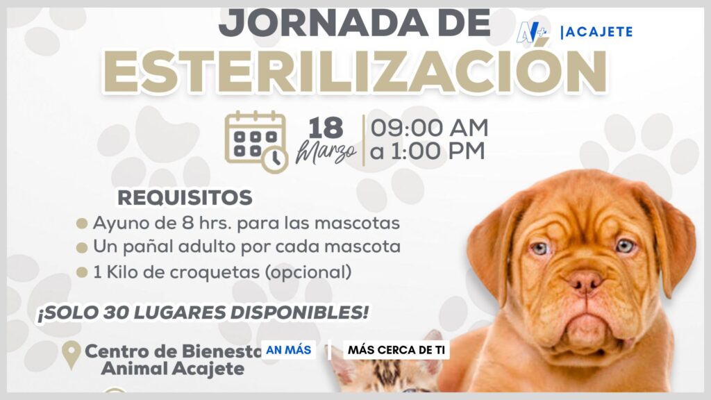 Acajete, Puebla. – Con el objetivo de promover el bienestar animal y el control responsable de la población de mascotas, el H. Ayuntamiento de Acajete, encabezado por el presidente municipal Cristian Flores Flores, invita a la comunidad a participar en la Jornada de Esterilización Canina y Felina, que se llevará a cabo el martes 18 de marzo.