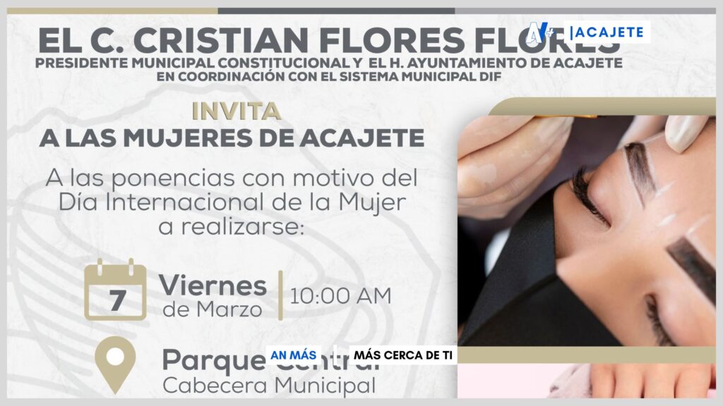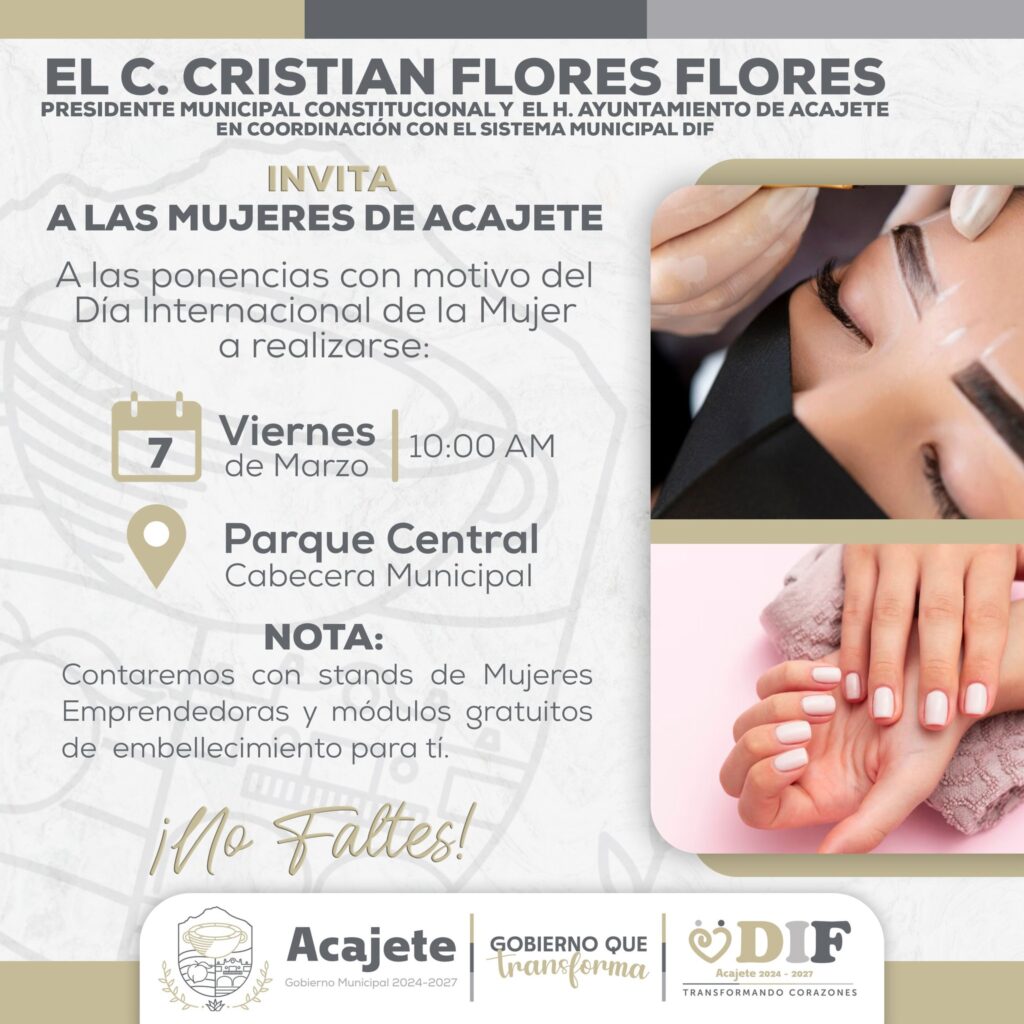 En el marco de la conmemoración del Día Internacional de la Mujer, el H. Ayuntamiento Municipal de Acajete 2024-2027, encabezado por el C. Cristian Flores Flores, en coordinación con el DIF Municipal y la presidenta Honoraria C. Crisna Lidia Flores Robles, invita a la ciudadanía a participar en una jornada especial de actividades.