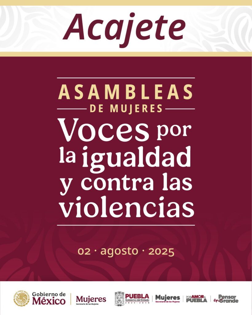 Acajete, Puebla. – La Secretaría de las Mujeres, en conjunto con el H. Ayuntamiento Municipal 2024–2027 que preside el ciudadano Cristian Flores Flores, y con el apoyo de la Instancia Municipal de Mujeres, convoca a todas las mujeres del municipio a participar en un importante espacio de diálogo y reflexión: las Asambleas de Mujeres bajo el lema “Voces por la igualdad y contra las violencias”.