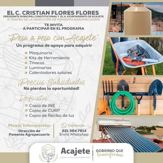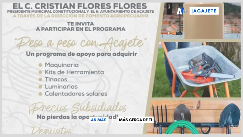 Acajete, Pue. – El Ayuntamiento de Acajete, encabezado por el presidente municipal Cristian Flores Flores, ha lanzado el programa “Peso a Peso con Acajete”, una iniciativa dirigida a los habitantes del municipio con el objetivo de facilitar la adquisición de maquinaria, kits de herramientas, tinacos, luminarias y calentadores solares a precios subsidiados.