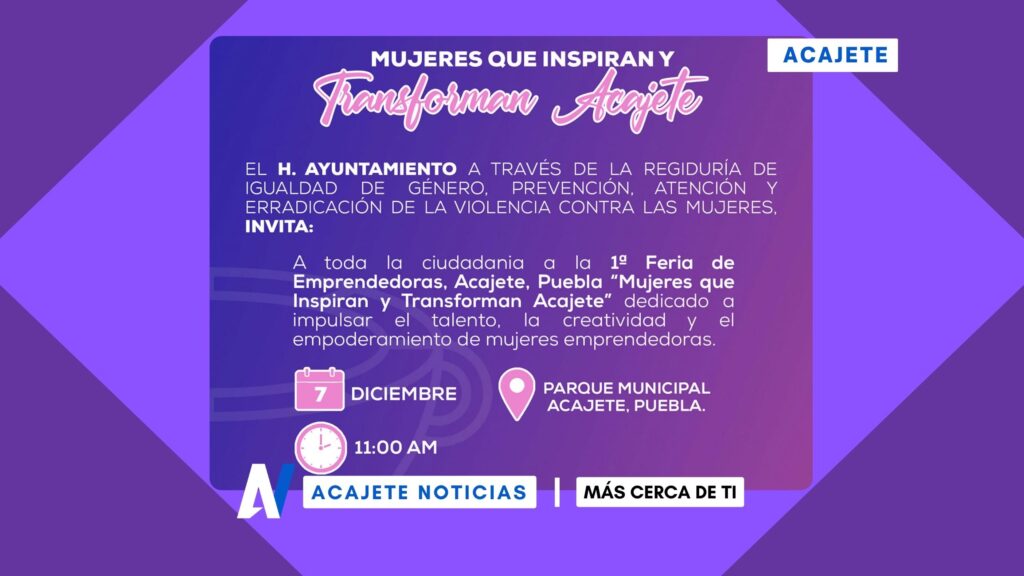 El próximo sábado 7 de diciembre, Acajete será escenario de un evento que promete destacar el talento, la creatividad y la determinación de las mujeres emprendedoras de la región. La explanada del Parque municipal será el punto de encuentro para la Primera Feria de Emprendedoras “Mujeres Que Inspiran y Transforman”, organizada por el H. Ayuntamiento Municipal.
