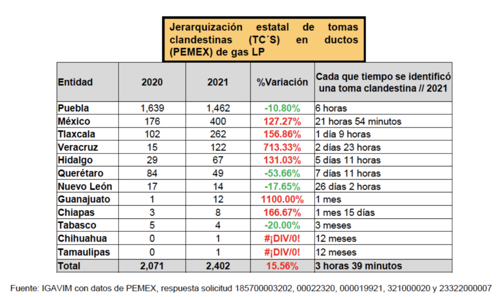 El estado de Puebla acaparó 60.86% del total de tomas clandestinas en ductos de gas LP detectadas en el país durante 2021, reveló el Instituto para la Gestión, Administración y Vinculación Municipal (IGAVIM).