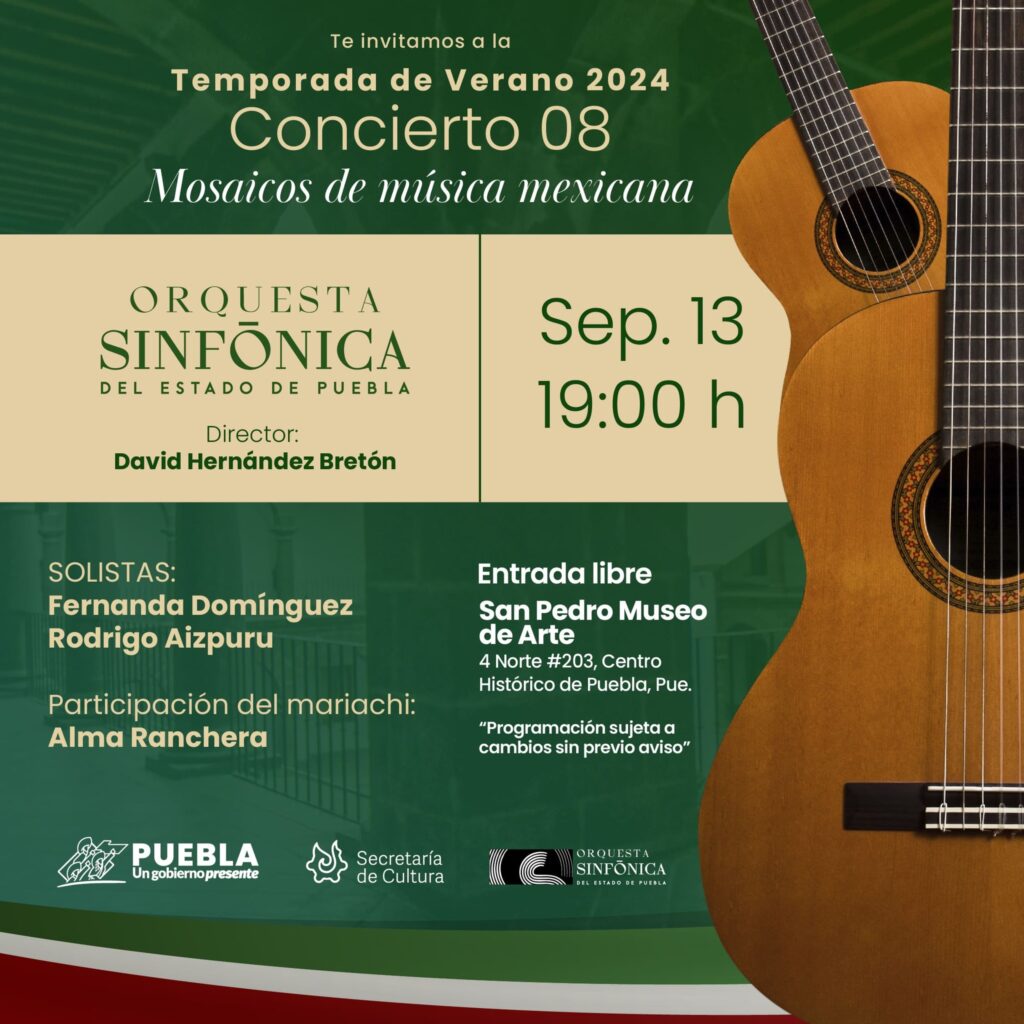 Asimismo, la programación contempla un concierto especial de la Orquesta Sinfónica del Estado de Puebla (OSEP) en San Pedro Museo de Arte; la música de “El trombón mexicano” con el cuarteto de trombones del CECAMBA, en el Museo Casa de Alfeñique; y las danzas “Voces Patrias en Movimiento” y “Zapateado Jarocho y Nueva Versada” en el Centro Cultural “San Roque”, esta se realizará el día viernes 14 de septiembre, a las 14:00 horas.
