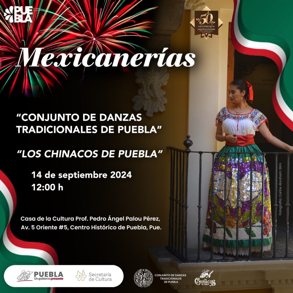 Una de las sedes será la Casa de la Cultura “Profesor Pedro Ángel Palou Pérez”, donde la dependencia llevará a cabo la presentación de “Mexicanerías”, una demostración de danzas tradicionales y de Los Chinacos de Puebla que tendrá lugar el día viernes 14 de septiembre, a las 12:00 horas.