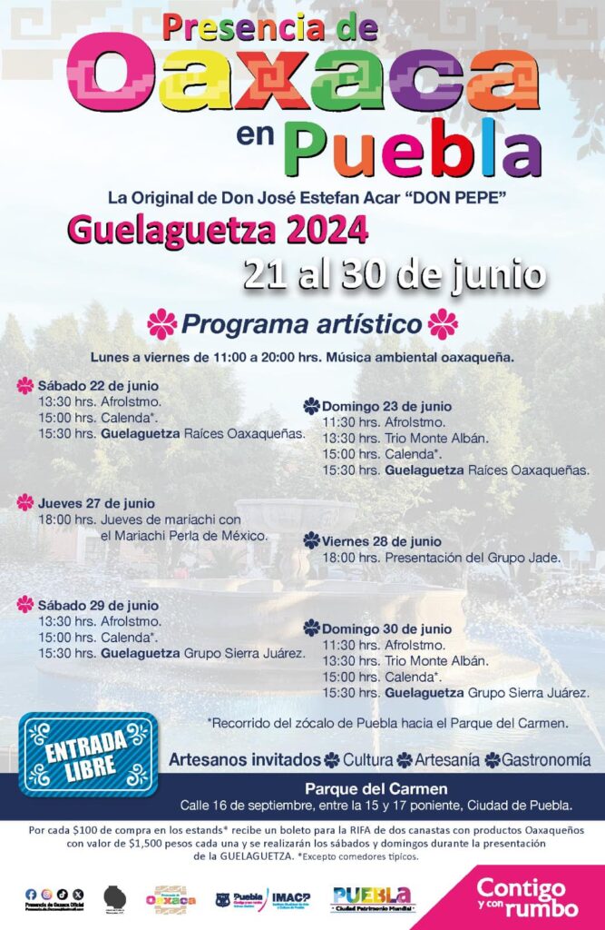 Del 21 al 30 de junio se realizará el evento Presencia de Oaxaca en Puebla 2024 que incluye la tradicional Guelaguetza, considerada la máxima representación artística y cultural del vecino estado.