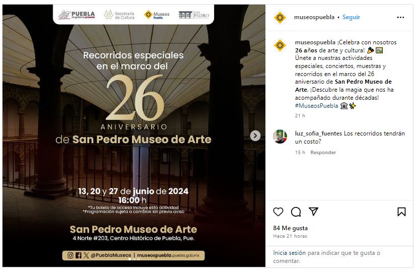 Anel Nochebuena, directora de Museos Puebla, dio a conocer que durante este mes se llevarán a cabo diversas actividades para celebrar el 26 aniversario de San Pedro Museo de Arte. Habrá recorridos guiados el 20 y 27 de junio para que las y los visitantes conozcan más de la historia del museo.
