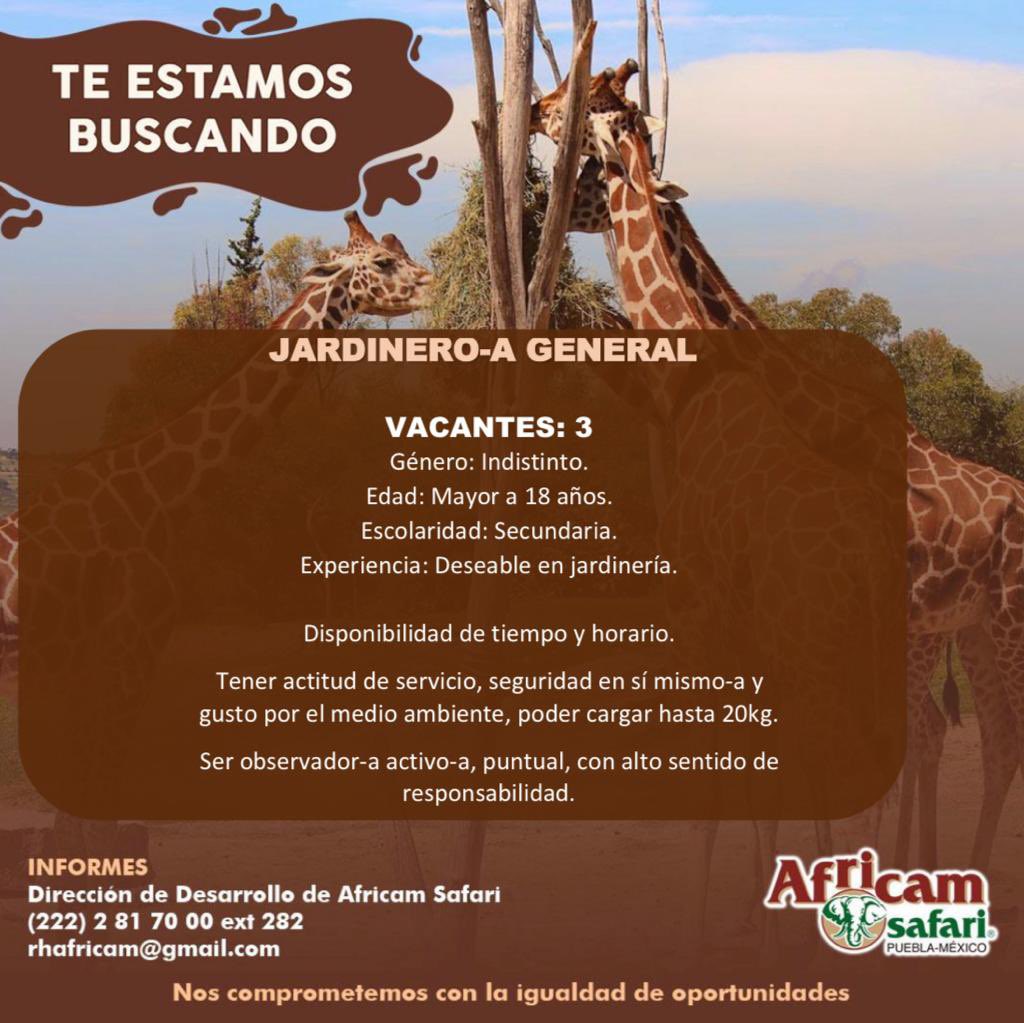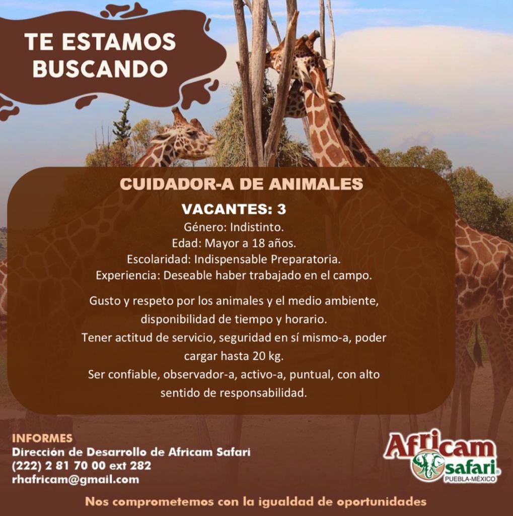 Africam Safari busca personas con habilidades de comunicación, experiencia previa en atención al público, trabajo en campo y, preferentemente, conocimientos sobre manejo de animales o ambientes naturales. Se valorarán especialmente cualidades como la responsabilidad, la puntualidad, la actitud positiva, el gusto por trabajar en equipo y la disponibilidad de tiempo.
