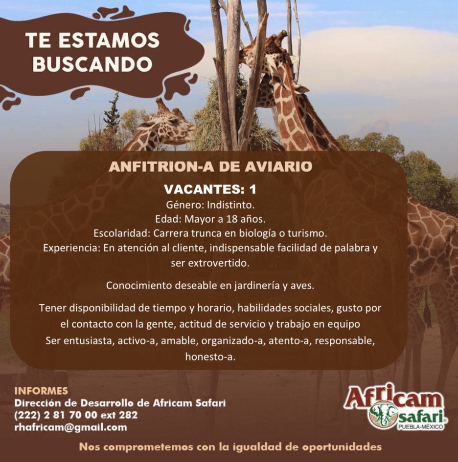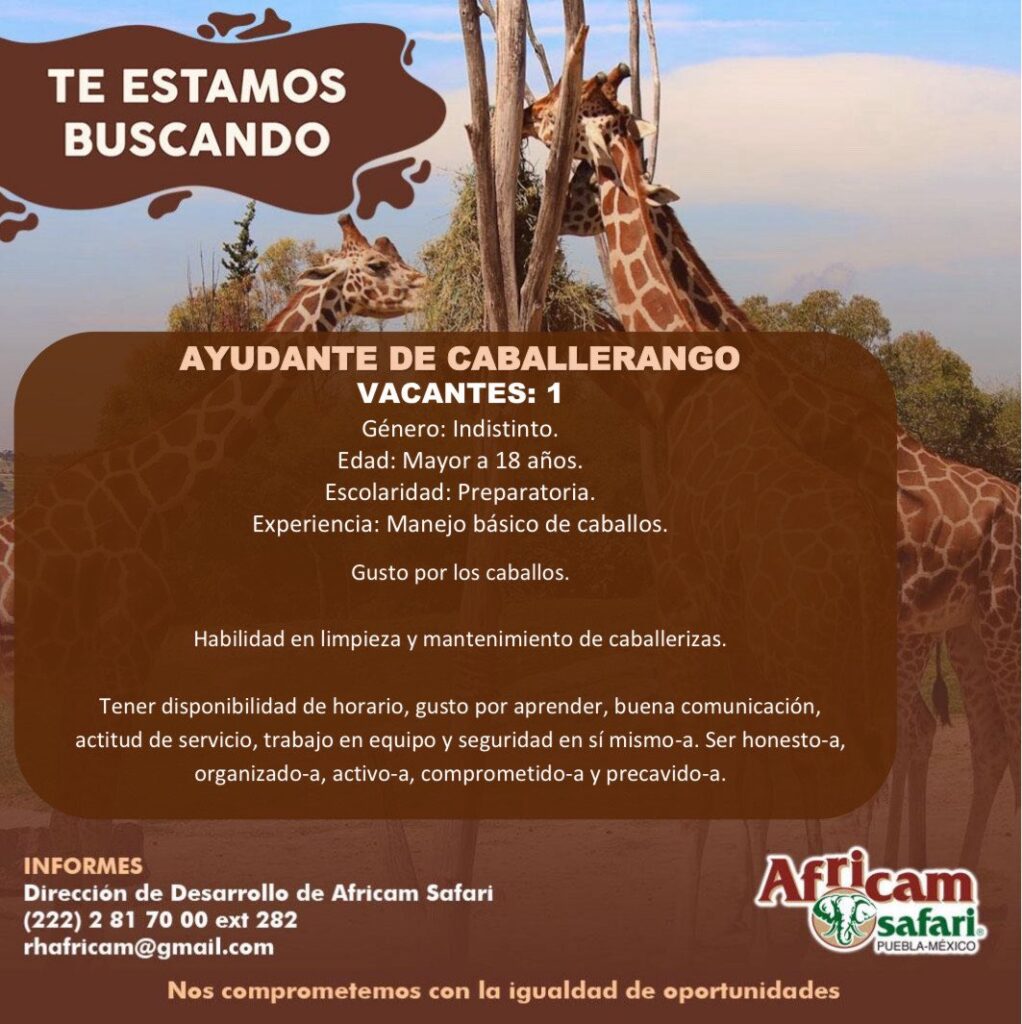 ¿Te apasiona la naturaleza y te gustaría formar parte de una experiencia única? Africam Safari, el reconocido parque de conservación de vida silvestre, está en búsqueda de nuevos talentos para integrarse a su equipo comprometido con el cuidado animal y el turismo sustentable.