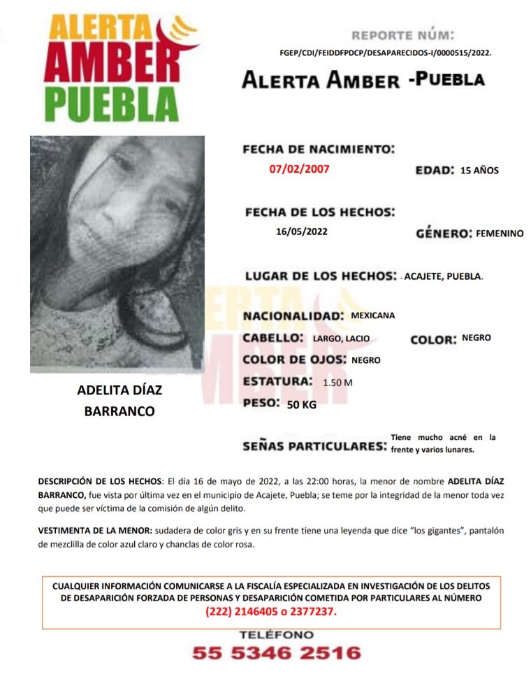 Acajete, Pue.- El día Lunes 16 de Mayo del 2022 en la tarde-noche vecinos y familiares a alertaron por redes sociales la desaparición de Adelita de 15 años de edad la cual salió de su domicilio para realizar unas compras y ya no regreso.