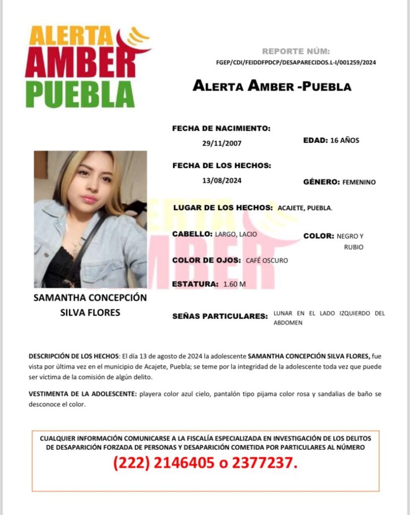 Solicitamos su apoyo para la búsqueda y localización de la adolescente SAMANTHA CONCEPCIÓN SILVA FLORES, de 16 años de edad. Fue vista por última vez en el municipio de Acajete, #Puebla.