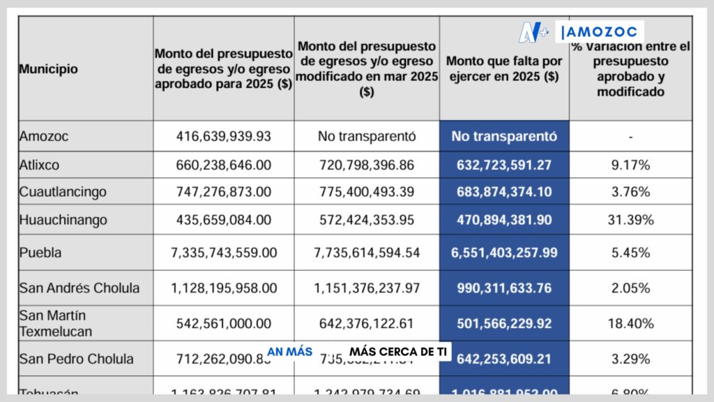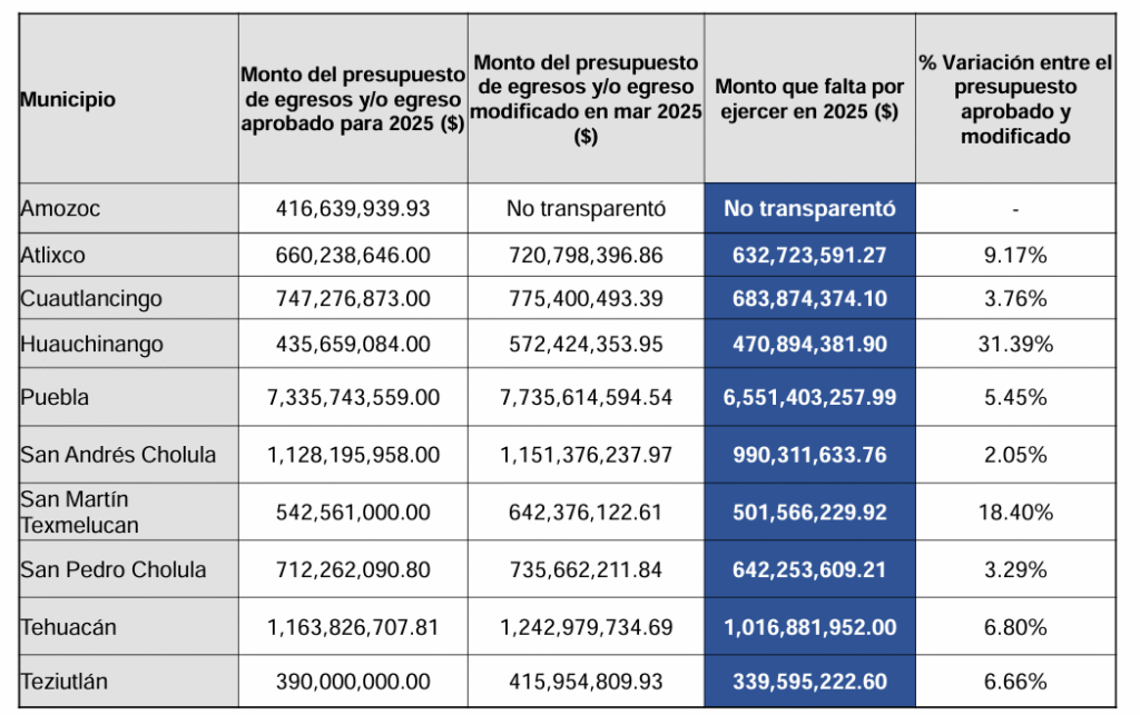 El informe también revela incrementos atípicos en ciertos rubros: Atlixco elevó en más de 58 millones el presupuesto de la Jefatura de Gestión Presupuestal, aunque apenas ha ejercido 205 mil pesos. En Huauchinango, la Tesorería rebasó los recursos asignados, mientras que en Puebla hubo aumentos en la Secretaría de Movilidad e Infraestructura.