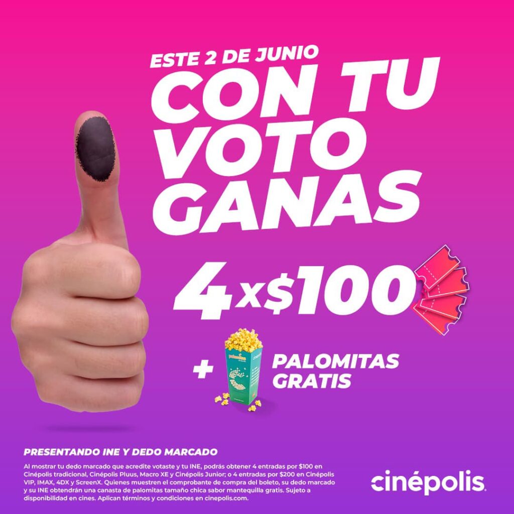 Bajo la promoción especial “Con tu voto ganas”, los asistentes que presenten su INE y muestren su dedo marcado después de votar, podrán adquirir cuatro boletos de cine por solo 100 pesos en las salas tradicionales y Cinépolis Plus, o 4 entradas por 200 pesos en salas VIP, IMAX, 4DX y ScreenX.