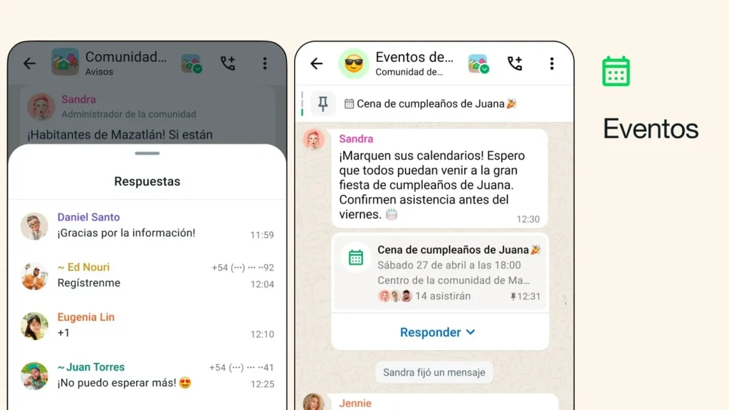 Esta herramienta permite a cualquier usuario del grupo crear un evento, a lo cual los demás miembros pueden responder. Así, todos en el grupo tendrán claro quién asistirá. Los eventos serán accesibles desde la página de información del grupo y, a medida que se acerque la fecha, los asistentes confirmados recibirán notificaciones automáticas. Inicialmente, esta característica estará disponible solo en los grupos que formen parte de una Comunidad, pero se espera su expansión a todos los grupos en los meses siguientes.