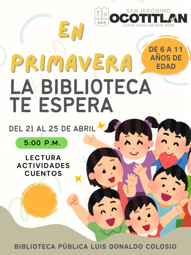 San Jerónimo Ocotitlán, Acajete, Pue. – Esta primavera, la Biblioteca Luis Donaldo Colosio invita a todas las niñas y niños de entre 6 y 11 años a vivir una experiencia inolvidable llena de creatividad, aprendizaje y diversión.