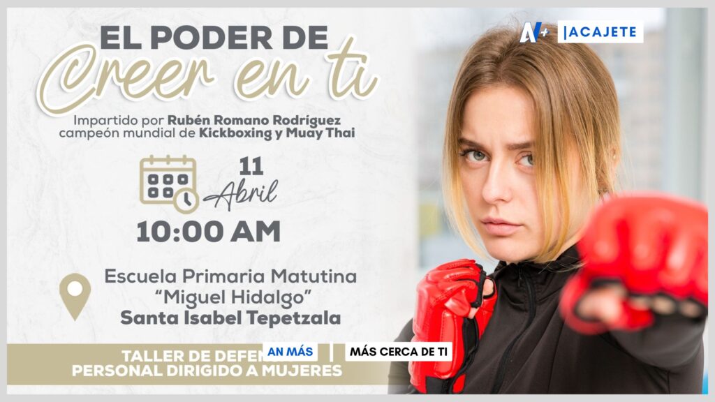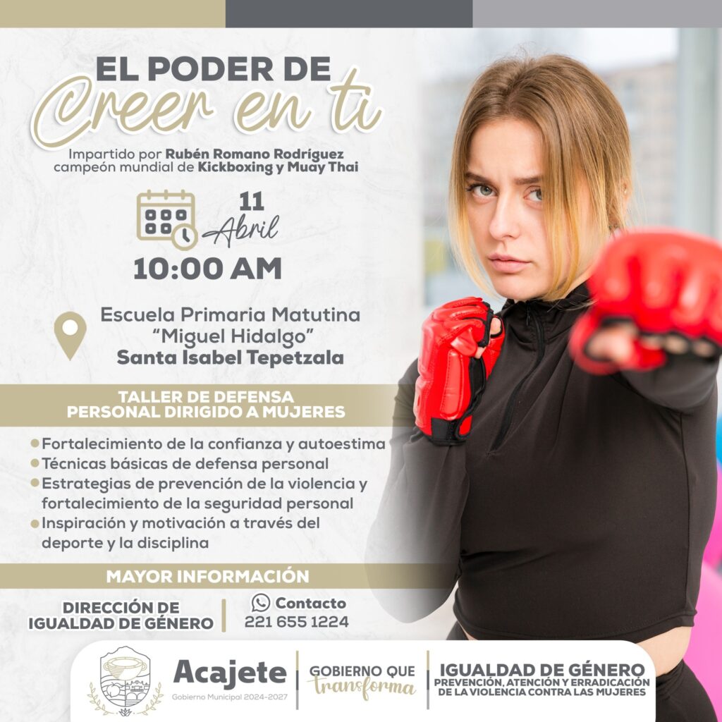 El Ayuntamiento de Acajete, encabezado por el alcalde Cristian Flores Flores, invita a todas las mujeres del municipio a participar en el taller “El Poder de Creer en Ti”, una iniciativa que busca fortalecer la confianza personal y la seguridad a través del conocimiento y la defensa personal.