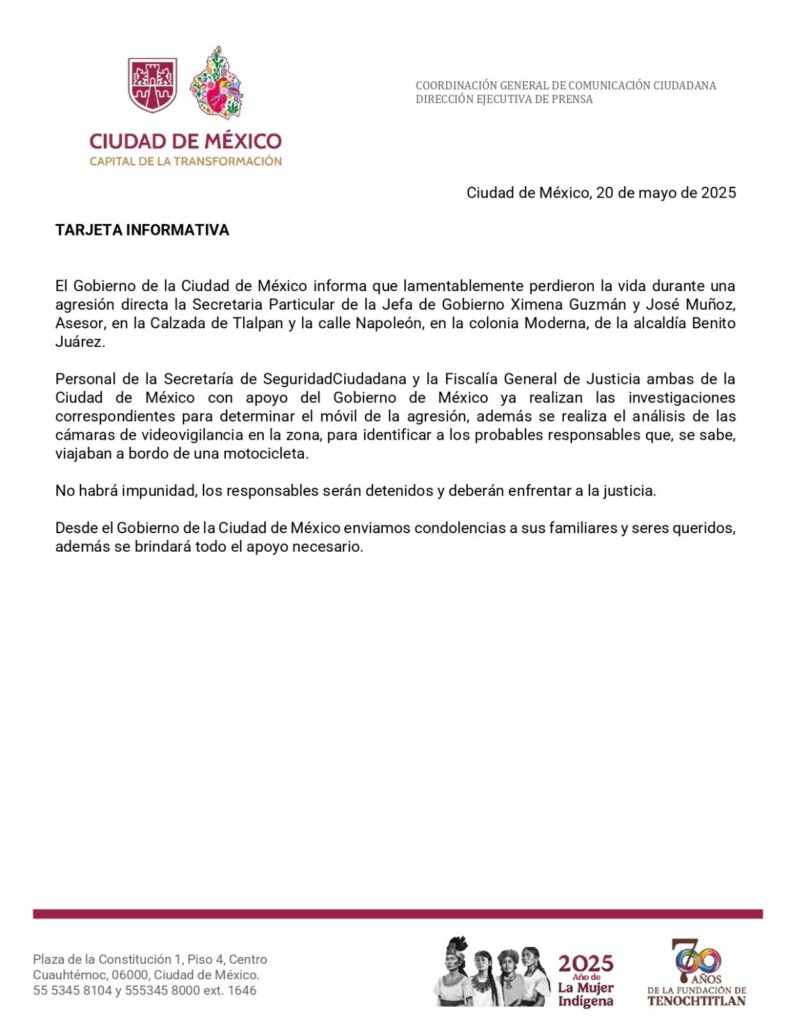 Ciudad de México.- Ximena Guzmán, secretaria particular de la jefa de Gobierno de la Ciudad de México, Clara Brugada, y el asesor José Muñoz, fueron asesinados la mañana de este martes en un ataque directo perpetrado por hombres armados a bordo de una motocicleta, en la colonia Moderna, alcaldía Benito Juárez.