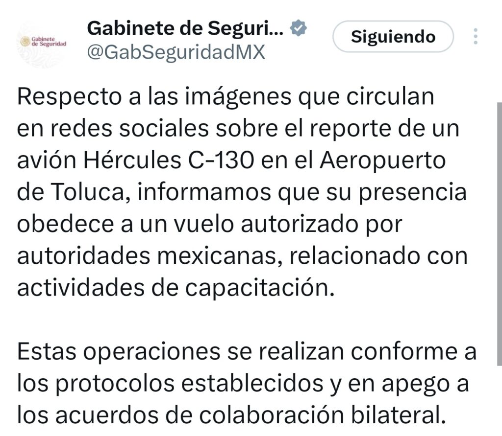 Por su parte, el gabinete de seguridad federal informó a través de redes sociales que el arribo de la aeronave corresponde a un vuelo autorizado por las autoridades mexicanas, relacionado con actividades de capacitación.