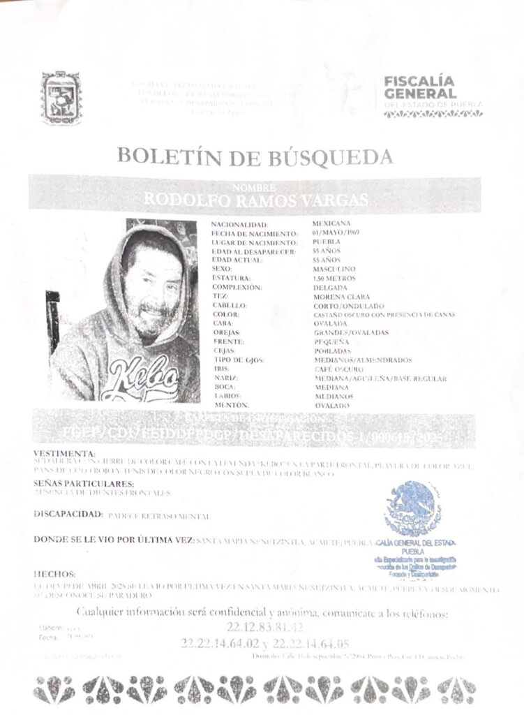 Santa María Nenetzintla, Acajete.— La comunidad de Santa María Nenetzintla se une en un llamado urgente de solidaridad para localizar al ciudadano Rodolfo Ramos Vargas, quien fue visto por última vez el pasado 19 de abril del presente año.