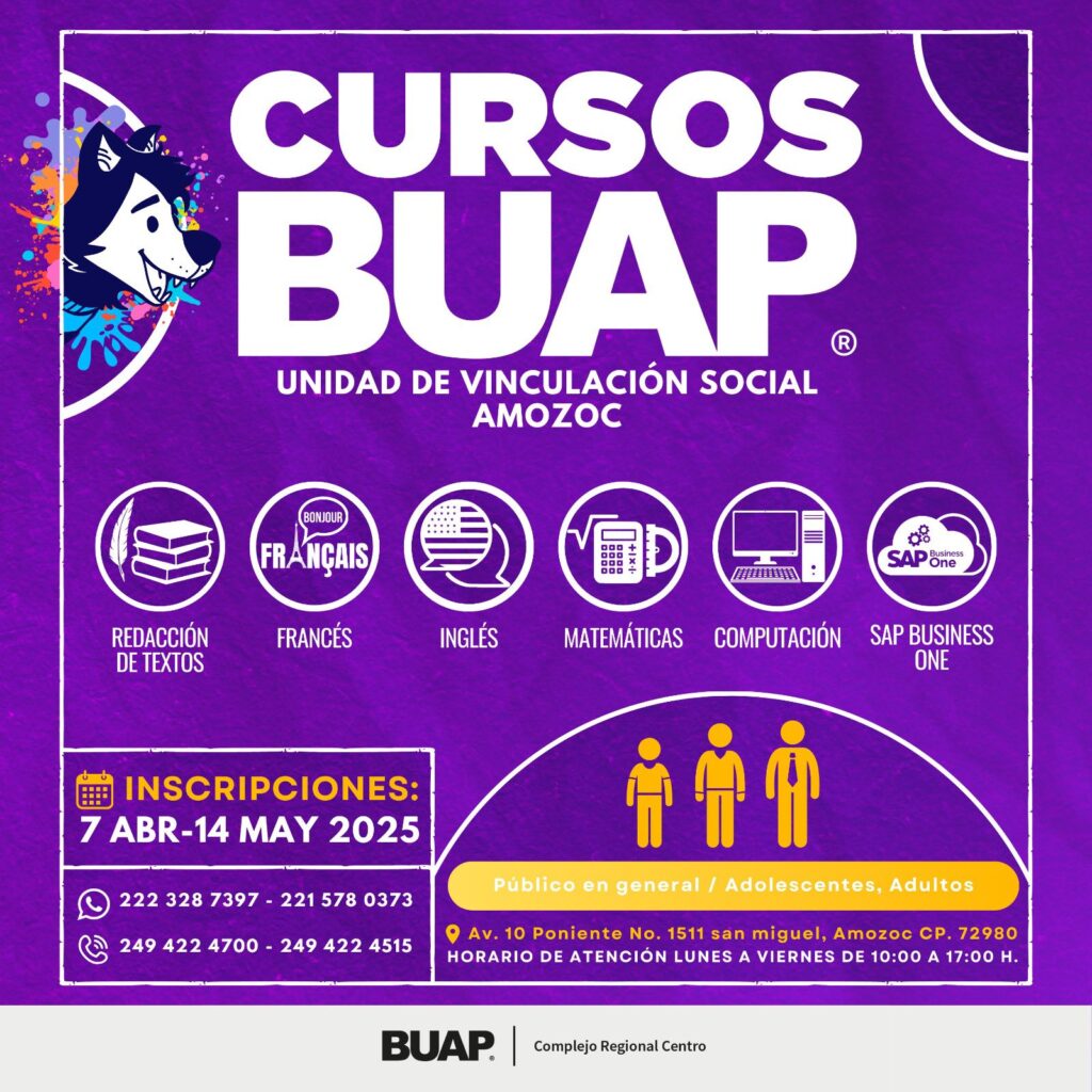 El Complejo Regional Centro de la Benemérita Universidad Autónoma de Puebla (BUAP), ubicado en Amozoc, invita a la comunidad universitaria y al público en general a inscribirse en sus Cursos de Extensión Universitaria.