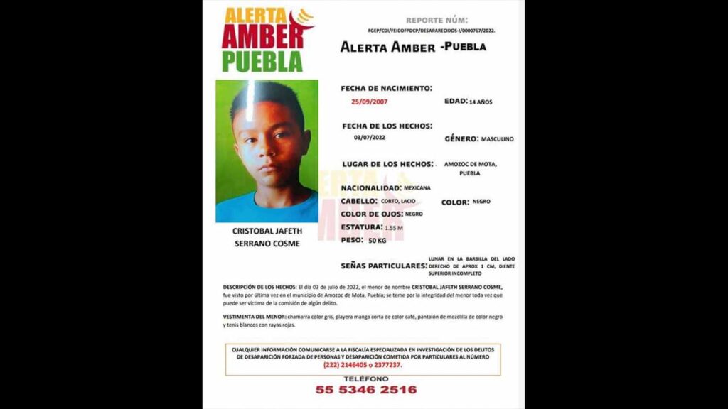 Amozoc, Pue.- Amigos y familiares buscan a Cristóbal Jafeth Serrano Cosme de 14 años, fue visto por última vez el pasado tres de julio en el municipio de Amozoc de Mota, por lo que se inició su búsqueda a través de la activación de la alerta Amber.