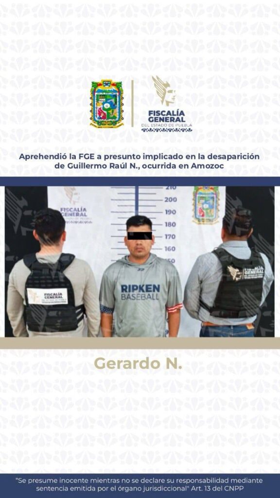 Este martes, la FGE confirmó la captura de Gerardo N., quien fue ubicado en el municipio de Amozoc y puesto a disposición del juez de control, acusado de desaparición cometida por particulares.