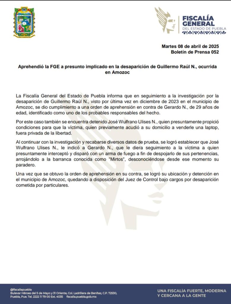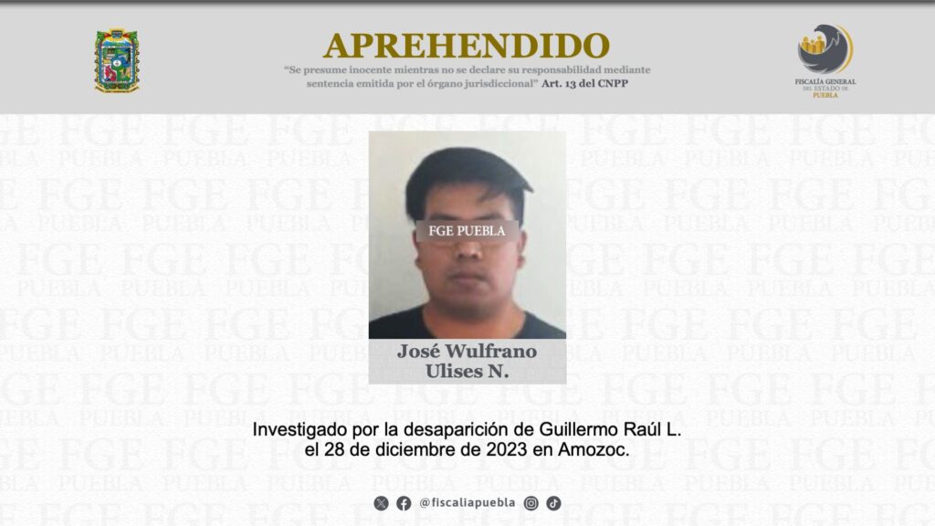 Amozoc, Puebla.- La Fiscalía General del Estado (FGE) de Puebla informó la aprehensión de Gerardo N., de 29 años de edad, señalado como el segundo posible implicado en la desaparición de Guillermo Raúl N., joven que fue visto por última vez el 28 de diciembre de 2023 en la junta auxiliar de Chachapa, municipio de Amozoc.