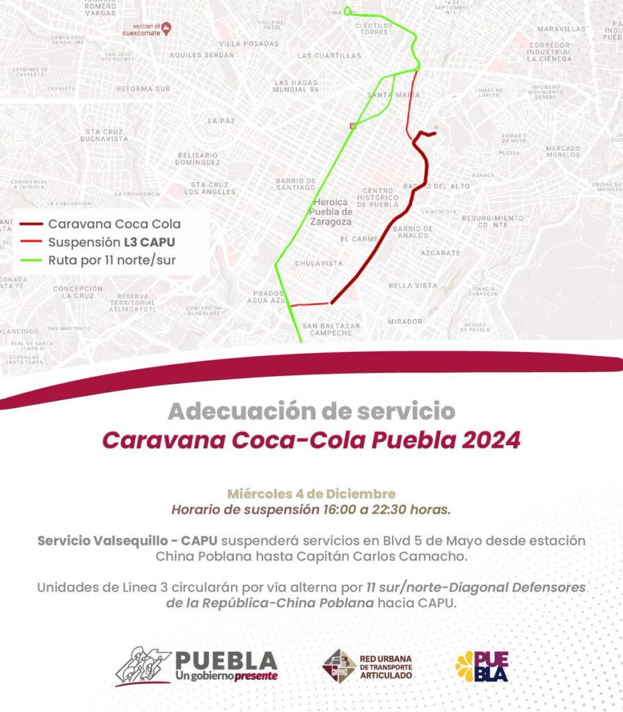 Este lunes 4 de diciembre, la tradicional Caravana Coca-Cola recorrerá las calles de Puebla, lo que ocasionará ajustes significativos en el servicio de transporte público y cierres viales en la ciudad. Desde las 17:00 hasta las 22:00 horas, al menos 50 rutas del transporte público y la línea 3 del sistema RUTA modificarán sus recorridos, informó José Hugo Cruz Cruz, subsecretario de Movilidad y Transporte estatal.