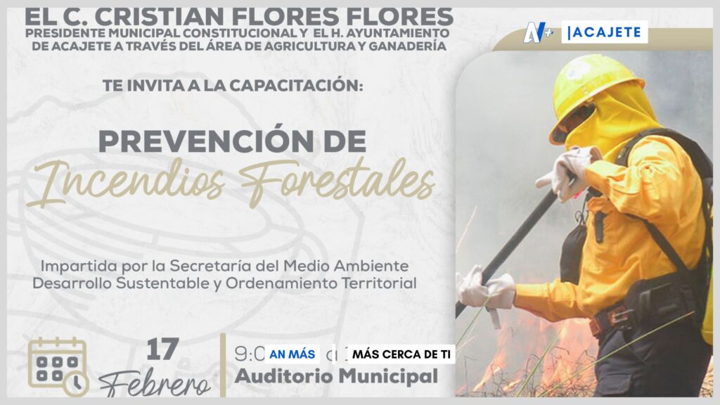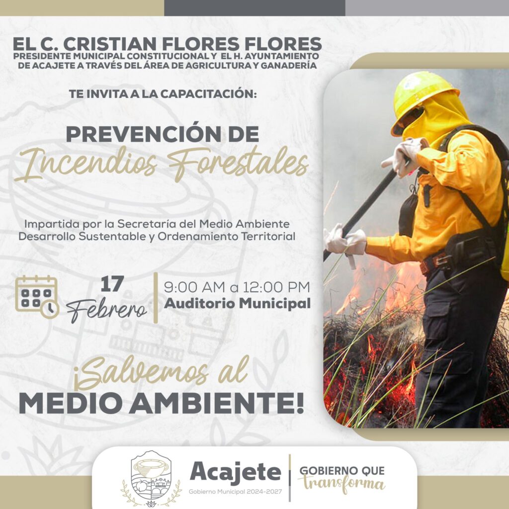 Acajete, Pue. – En un esfuerzo por proteger el medio ambiente y prevenir incendios forestales, el H. Ayuntamiento de Acajete, encabezado por el presidente municipal Cristian Flores Flores, invita a la ciudadanía a participar en la capacitación “Prevención de Incendios Forestales”.