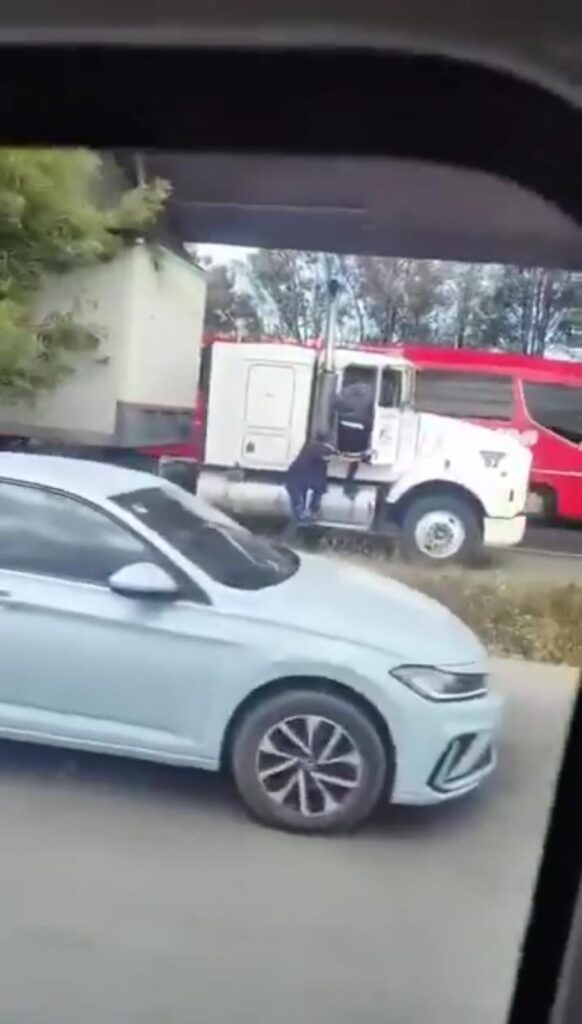 El incidente fue grabado por un automovilista, quien captó el momento en que los presuntos delincuentes amenazan al operador para que les abriera la puerta de la unidad. Al verse en peligro, el conductor permitió el acceso y se observa cómo los sujetos suben al tráiler.