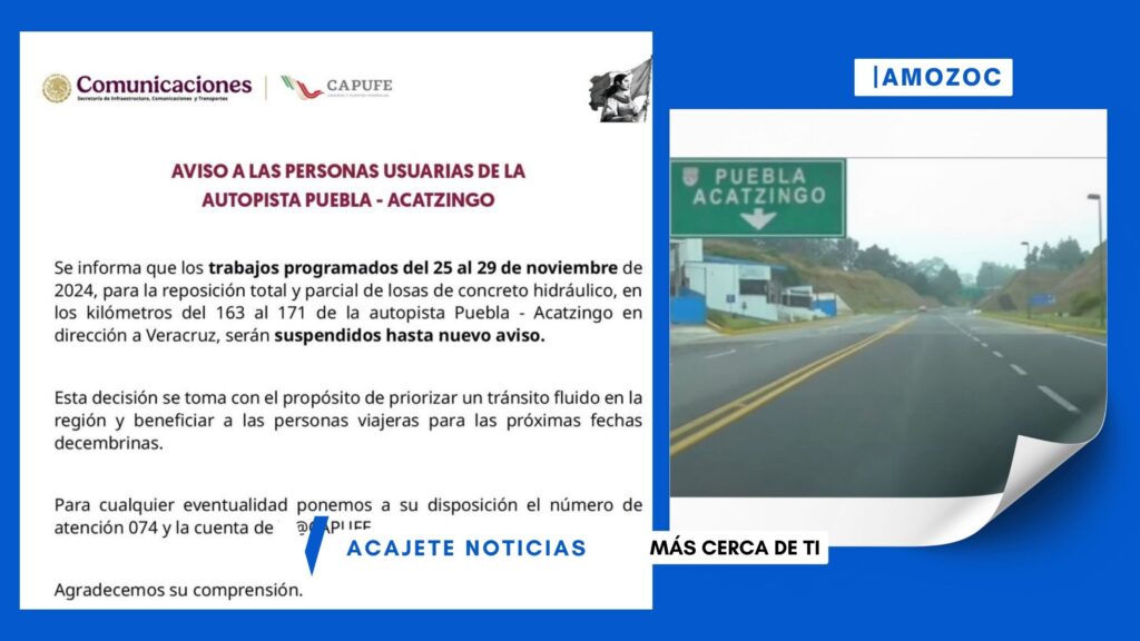 Caminos y Puentes Federales (CAPUFE) anunció la suspensión temporal de las obras de mantenimiento en el tramo Acatzingo-Amozoc de la autopista Puebla-Orizaba, con el objetivo de facilitar el flujo vehicular durante la temporada vacacional de fin de año.