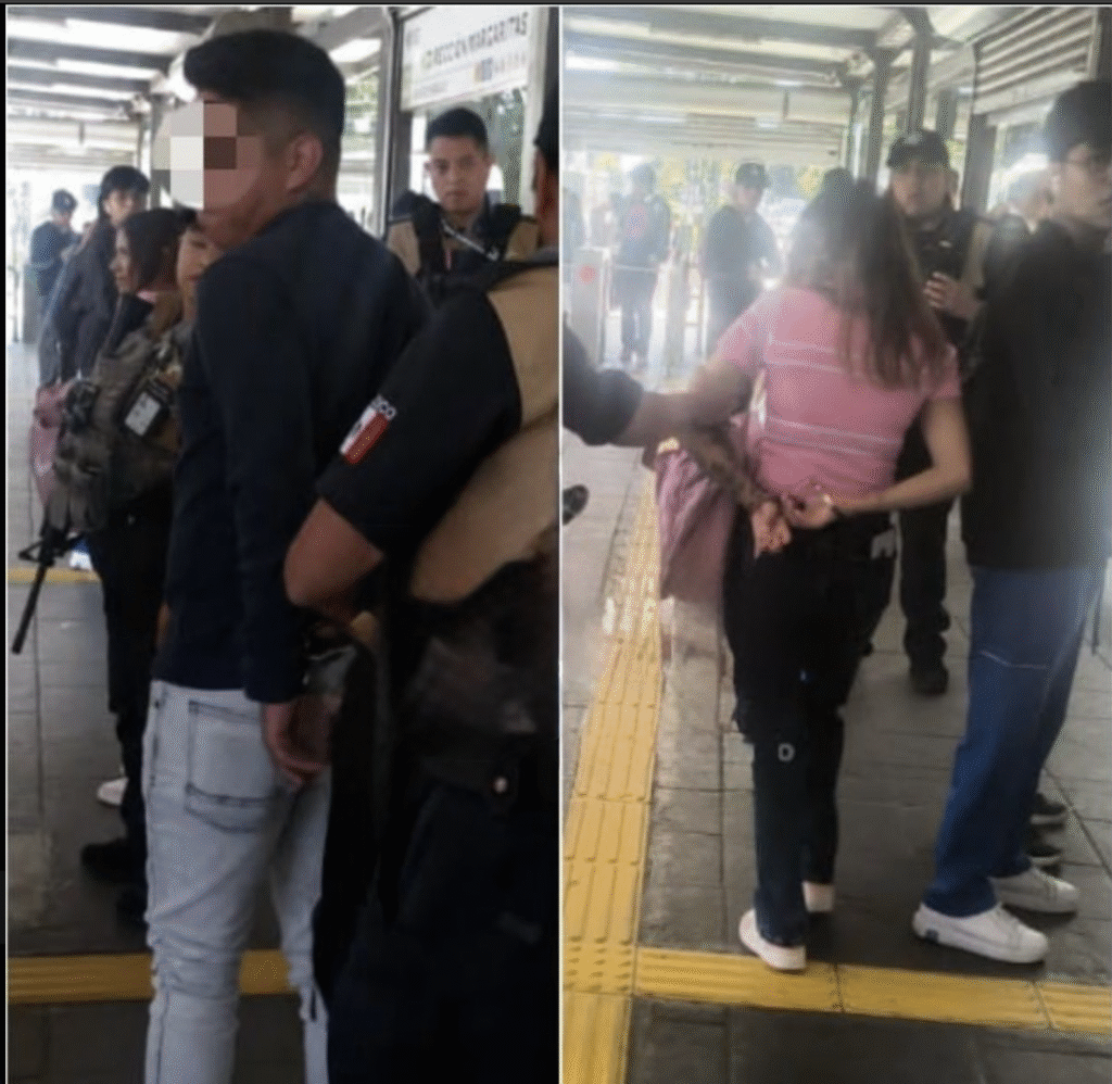 Carla Yajaira N. y su pareja sentimental, identificado como Abel N., fueron detenidos tras ser señalados como carteristas de la Línea 1 de RUTA, en la ciudad de Puebla.