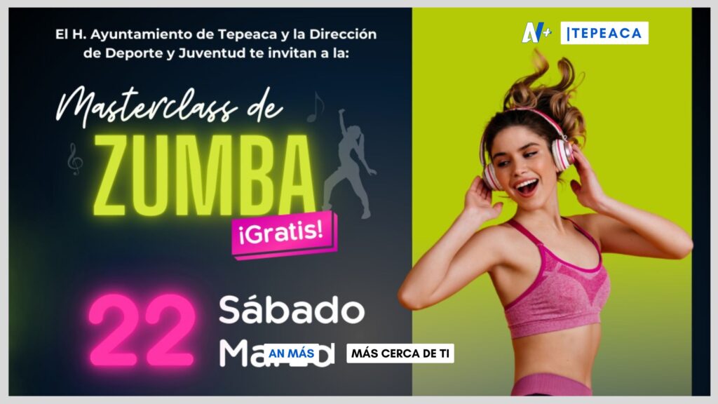 La Dirección de Deporte y Juventud de Tepeaca ha extendido una invitación a toda la ciudadanía para participar en una clase de Zumba que se llevará a cabo el próximo sábado 22 de marzo a las 9:00 horas en la Segunda Sección del Parque de la Familia.