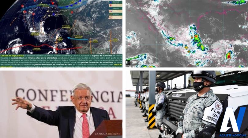 Un canal de baja presión que se extiende sobre el norte, occidente y centro de la República Mexicana en interacción con divergencia en altura y el ingreso de humedad de ambos litorales, ocasionará lluvias puntuales intensas en Nayarit, Jalisco, Colima, Michoacán, Querétaro, Hidalgo y Puebla, lluvias puntuales muy fuertes en Sonora, Guanajuato, Estado de México, Ciudad de México, Morelos y Guerrero, lluvias puntuales fuertes en Chihuahua, Sinaloa, Durango, Zacatecas, Aguascalientes y Tlaxcala, así como chubascos en Baja California y Baja California Sur.