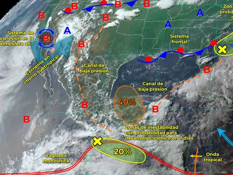 Persistirá un temporal de lluvias muy fuertes a puntuales torrenciales en el sureste mexicano y la Península de Yucatán, debido a un canal de baja presión; la vaguada monzónica; dos zonas de inestabilidad con probabilidad de desarrollo ciclónico, una al sur de Guerrero y otra sobre el suroeste del Golfo de México; así como a la nueva onda tropical 3 que se desplazará al sur de la Península de Yucatán.