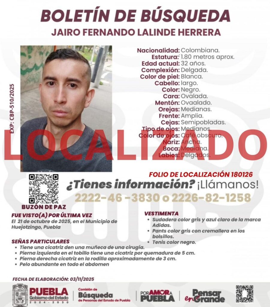 Dos hombres de origen colombiano, reportados como desaparecidos desde el pasado 21 de octubre de 2025, fueron localizados sin vida en la junta auxiliar de Santa María Tianguistenco, en el municipio de Huejotzingo.