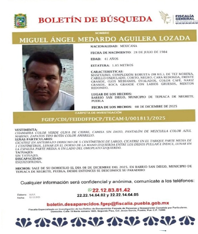 A una semana de su desaparición, familiares y autoridades mantienen la búsqueda de Miguel Ángel Medardo Aguilar Lozada, de 41 años de edad, empresario dedicado a la comercialización de alimento para ganado, cuyo paradero se desconoce desde el pasado 8 de diciembre en el municipio de Tepeaca.