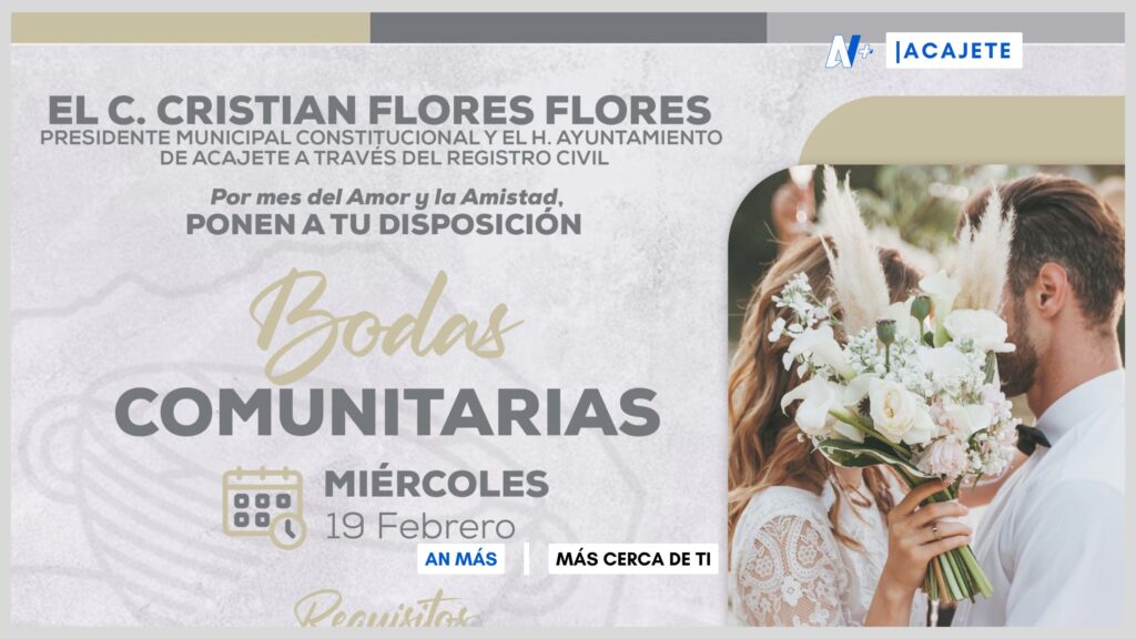 Acajete, Puebla. – En el marco del Mes del Amor y la Amistad, el presidente Municipal Constitucional de Acajete, Cristian Flores Flores, ha puesto en marcha la “Jornada de Bodas Comunitarias”, una iniciativa que permitirá a las parejas formalizar su unión con costos accesibles y descuentos especiales.