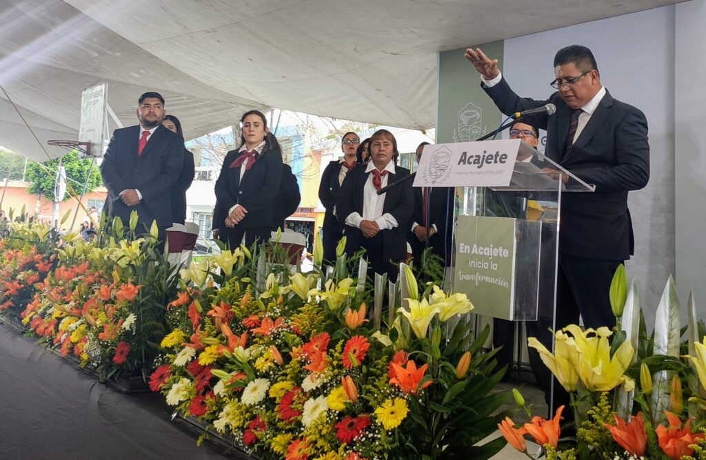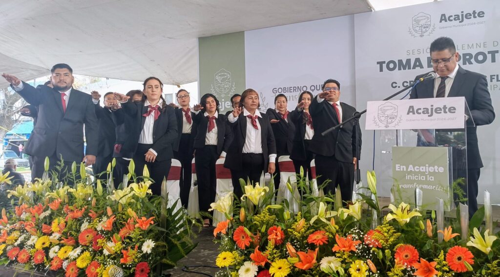 Acajete, Pue.- Ayer martes 15 de octubre del año en curso, tal y como lo marca la ley, se llevó a cabo la sesión solemne de la Toma de Protesta de Cristian Flores Flores como Presidente Municipal Constitucional de Acajete para el periodo 2024-2027, quien en su primer discurso anunció que su administración será firme en la aplicación de estrategias para reforzar la seguridad en su municipio.