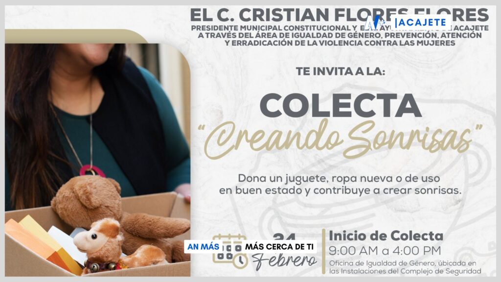 Acajete, Pue. – Con el objetivo de llevar alegría a quienes más lo necesitan, el Gobierno Municipal Acajete, a través del Área de Igualdad de Género, Prevención, Atención y Erradicación de la Violencia Contra las Mujeres, ha lanzado la campaña “Colecta Creando Sonrisas”.