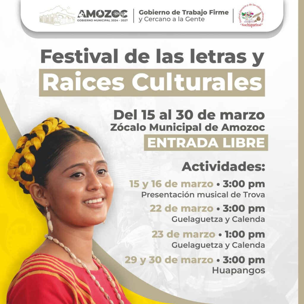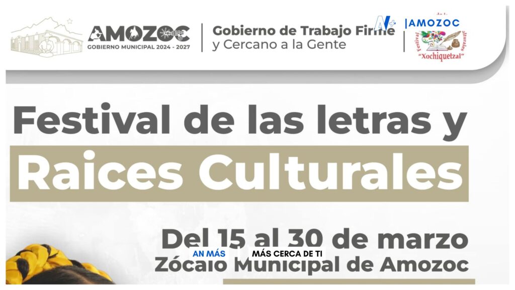 El gobierno de Amozoc y el presidente municipal Severiano de la Rosa invitan a la comunidad al Festival Literario y de las Raíces Culturales “Xochiquetzal”, que se llevará a cabo en el zócalo municipal del 15 al 30 de marzo. La entrada es completamente libre.