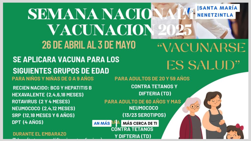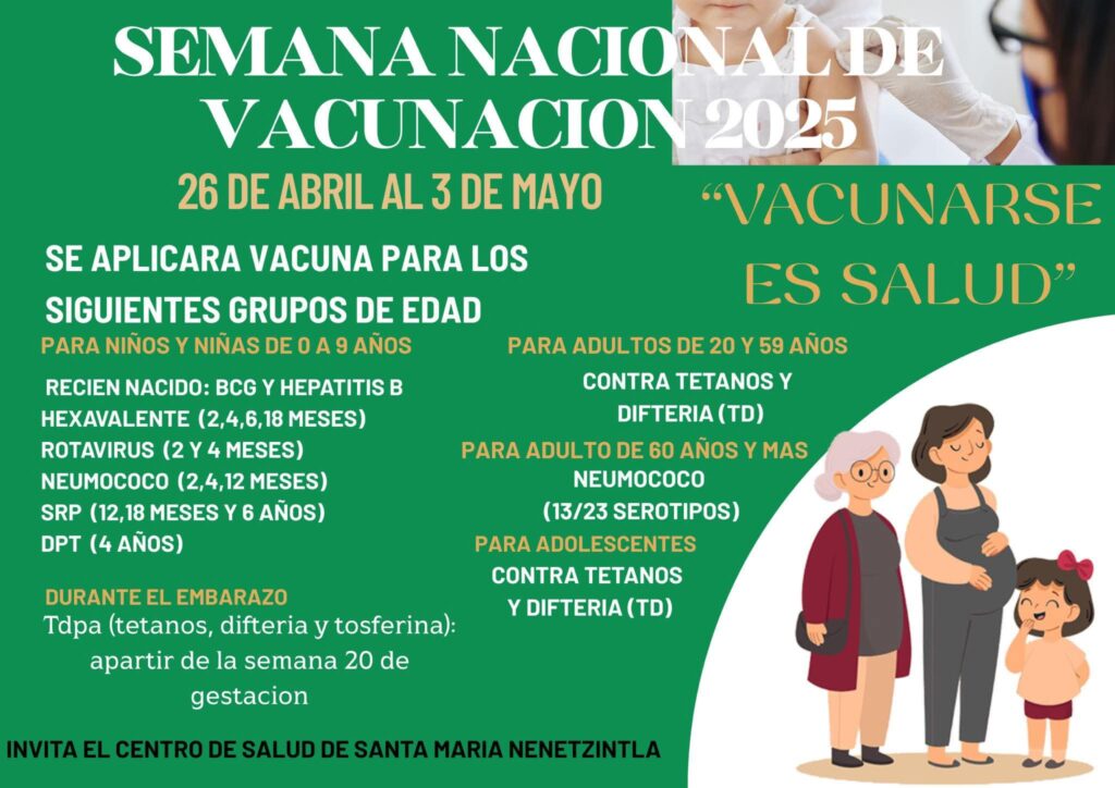 La presidencia auxiliar de Santa María Nenetzintla, encabezada por el presidente Jibran Sánchez Aguilar, en coordinación con el Centro de Salud local, convoca a toda la comunidad a participar activamente en la Semana Nacional de Vacunación, que se llevará a cabo del 26 de abril al 03 de mayo.