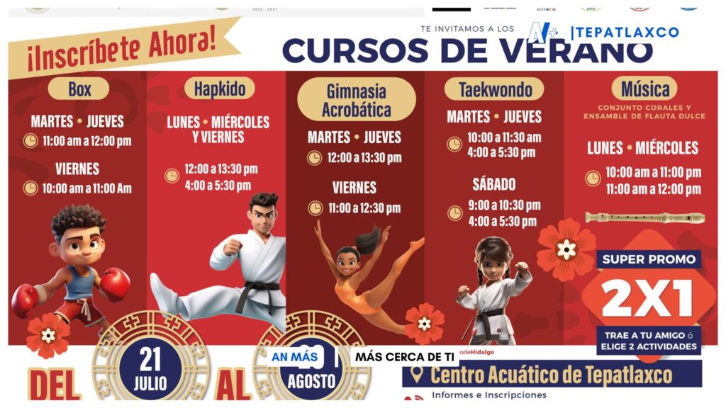 El H. Ayuntamiento de Tepatlaxco de Hidalgo, a través del Sistema DIF Municipal, lanza una cordial invitación a niños, jóvenes y familias a disfrutar de los Cursos de Verano 2025, diseñados para fomentar el aprendizaje, el deporte y el desarrollo personal en un ambiente sano y profesional.