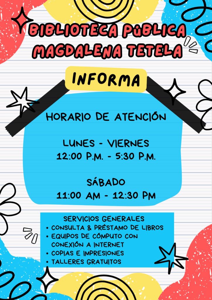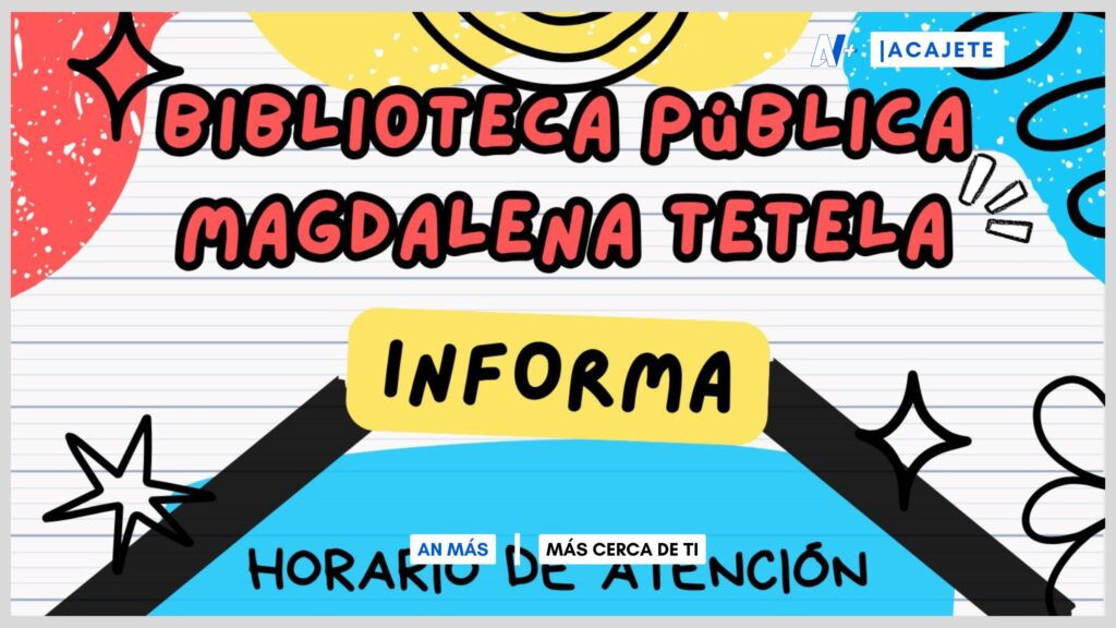 La Magdalena Tetela, Acajete. – La biblioteca de la junta auxiliar La Magdalena Tetela ha dado a conocer su horario de atención y la variedad de servicios que ofrece a la comunidad. Este espacio educativo abre sus puertas de lunes a viernes de 12:00 p.m. a 5:30 p.m., y los sábados de 11:00 a.m. a 12:30 p.m.