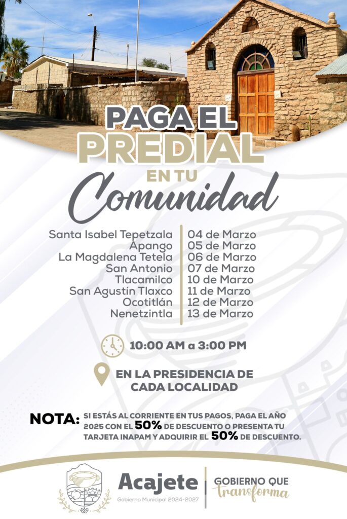 Acajete, Pue. – Con el objetivo de apoyar la economía de los ciudadanos, el presidente municipal de Acajete, Cristian Flores Flores, ha instruido que se otorgue un 50% de descuento en el pago del impuesto predial 2025 y años anteriores a los adultos mayores que presenten su credencial del INAPAM e INE.