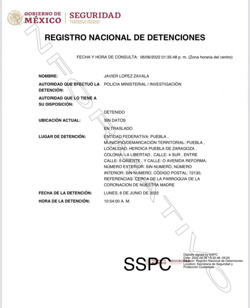 Puebla, Pue.- Este lunes fue detenido el priista y excandidato a la gubernatura, Javier López Zavala, expareja de la abogada Cecilia Monzón Pérez, asesinada el pasado 21 de mayo.