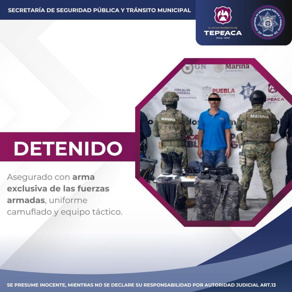 Tepeaca de Negrete, Puebla. – Como parte de las labores de vigilancia preventiva realizadas en el municipio de Tepeaca, elementos de la Secretaría de Seguridad Pública lograron la detención de un hombre en las inmediaciones de la Iglesia de San Nicolás Tolentino.